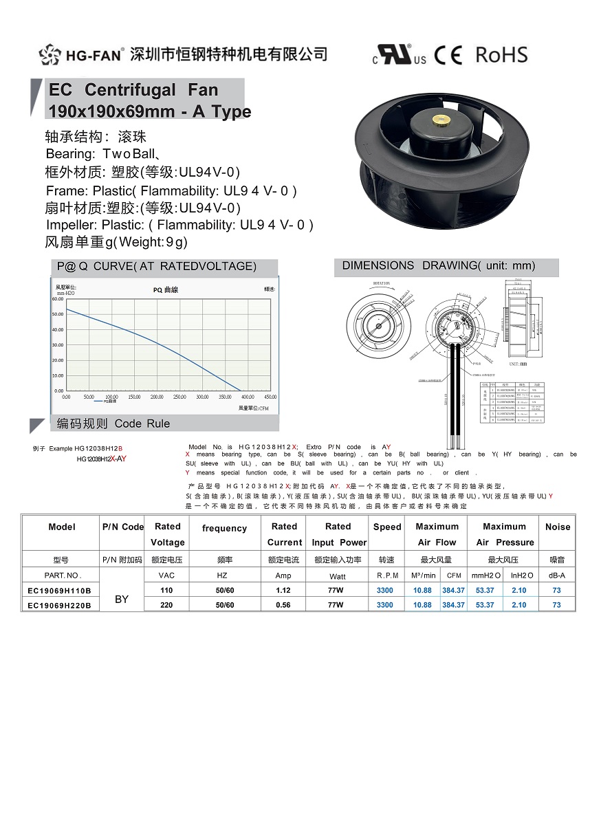产品名称:EC交流变频离心风扇190X69MM